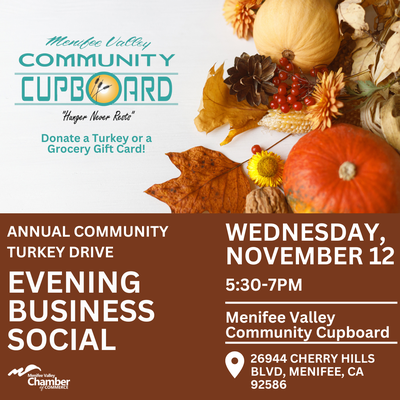 Join us and the Menifee Valley Community Cupboard Thrift Shop & Holiday Store for their Annual Turkey Drive! Bring a turkey or grocery gift card to support this drive . We can’t wait to see you there!