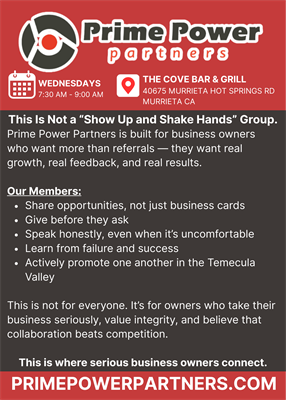 If you’re a small business owner in the area and you’re tired of “networking” that feels like a room full of sales pitches… come check out Prime Power Partners.We’re a relationship-first group that meets weekly to build real partnerships and consistent referrals—without the awkward vibe.