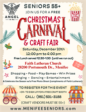 Our Christmas Carnival and Lunch is for Seniors 55+ only. BUT our CRAFT FAIR is for All Ages to shop at! (Craft booth owners must be over 55 years old.)